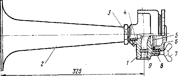 Тифон состоит из корпуса / (рис. 227), в который при помощи штуцера ввернут рупор 2. Фиксация рупора в корпусе осуществляется с помощью сухарика 4 и винта 3. В торце корпуса установлена крышка 6, между крышкой и корпусом зажата мембрана 5, уплотненная резиновым кольцом 8. Сжатый воздух поступает через ниппель 9 в нижнюю часть корпуса. Регулируют тифон, закручивая или откручивая крышку, при этом увеличивается или уменьшается громкость звукового сигнала. Для фиксации крышки в определенном положении служит барашковый винт 7.