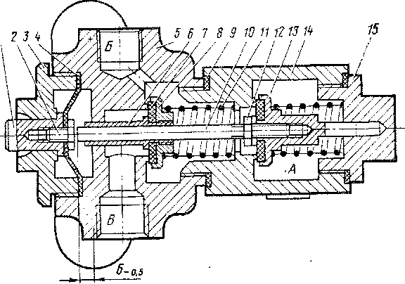 Клапан А16-000 (тифона и свистка). Он устанавливается в кабине машиниста и служит для привода в действие тифона и свистка. В корпус 5 (рис, 228) клапана ввернут тройник 14, внутри тройника расположены два клапана 8 и 13. Тройник закрыт пробкой 15. Левый клапан 8 состоит из пустотелого стержня 6, гнезда и резиновой прокладки 7. Гнездо правого клапана повернуто к стержню 10, имеющему резиновую прокладку 9, которая прижимается гайкой 12. Оба клапана к своим седлам прижимаются пружинами //. Между корпусом 5 и крышкой 3 зажата кожаная диафрагма 4. В центре диафрагма крепится винтом 2 к толкателю 1. Для уплотнения соединений корпуса с тройником и тройника с пробкой установлены резиновые прокладки. В тройнике имеется прилив с отверстием, куда подводится сжатый воздух. Через отверстие Б воздух поступает на свисток, а через отверстие В — на тифон.