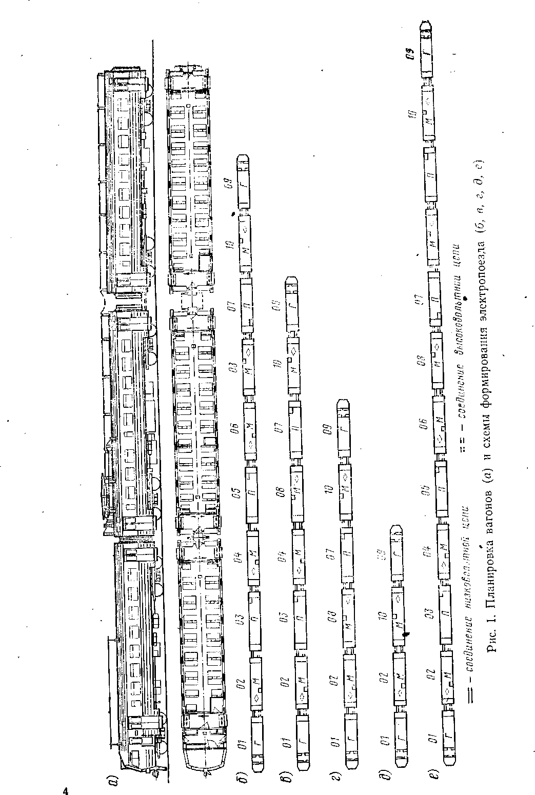 Составность поезда. За основную поездную единицу принят 10-вагонный электропоезд, состоящий из двух головных (Г),' пяти моторных (М) и трех прицепных (П) вагонов (рис. 1). Однако поезд можно формировать из 4, 6, 8 и 12 вагонов. Уменьшение числа вагонов достигается исключением одной, двух или трех секций. Каждая секция состоит из моторного и прицепного вагонов. Цифры на рис. I, б, в, г, д, е означают окончания номеров вагонов.
