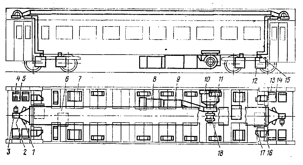 Вентиляция. Салоны электропоезда оборудованы принудительной вентиляцией. В чердачных помещениях над тамбурами установлено по одному вентиляционному агрегату 3 (рис. 100) типа 013/000 по ТУ 24-5-361-76.